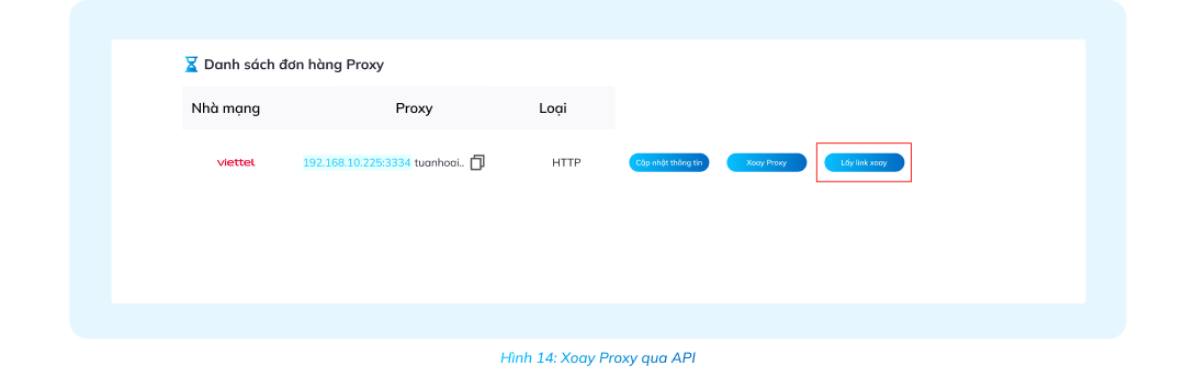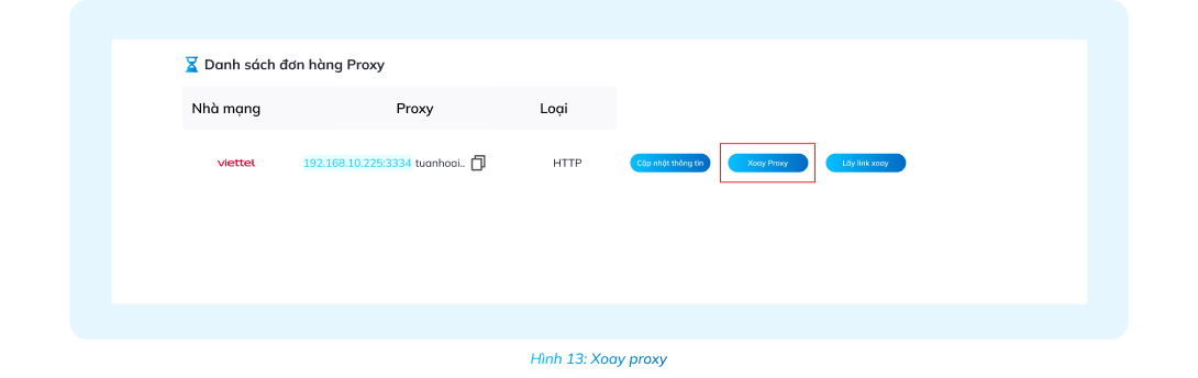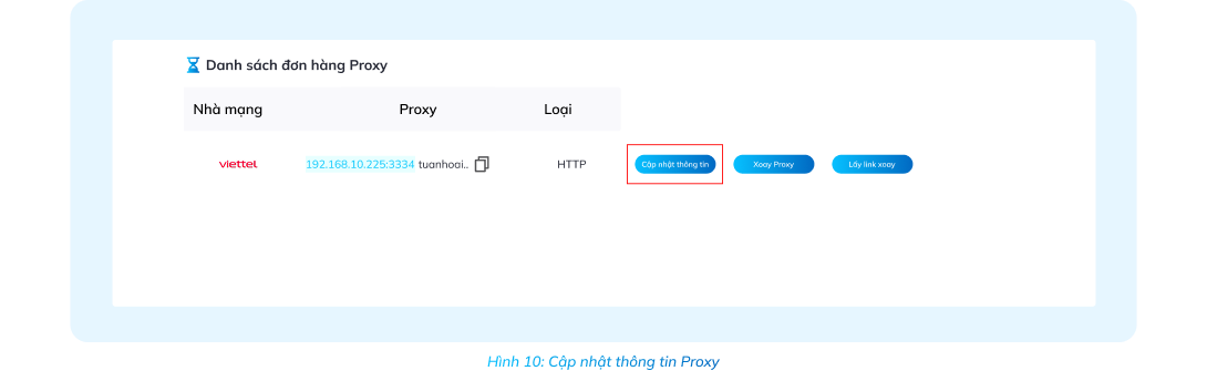 Vào mục Đơn hàng Proxy xoay, chọn proxy cần sử dụng => Chọn Cập nhật thông tin